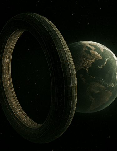De todos os pontos do globo — cidades, desertos, montanhas e oceanos — pôde-se ver algo colossal se aproximando do planeta. Uma estrutura metálica, de proporções inconcebíveis, maior do que a própria Terra, movia-se lentamente pelo espaço, cercando o planeta até formar um gigantesco anel, como se a Terra tivesse agora o seu próprio cinturão, semelhante ao de Saturno.
